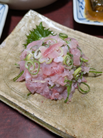 雑魚のたたき・・・流通に乗らない極小のソコイトヨリと極小のカイワリをたたきにしました。 シンプルに刻んだ細ネギと大葉、おろし生姜のみで合わせました。 ソコイトヨリの皮のつるっと感、カイワリの微妙な脂感が口の中で混ざっりあって、日本酒が進むジョー!