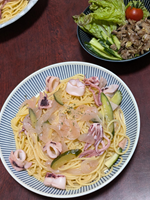定番だね? たらこクリームパスタに輪切りにしたマルイカとしめじを加えちゃったんだジョー! 定番だから間違いなく美味い!! でもパスタの分量間違えて多く茹でちゃったから、クリームパスタじゃなくて、普通のたらこパスタみたいな見た目になっちゃいました・・・。