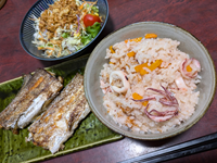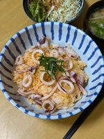 炊きあがったご飯に荒く刻んだキムチと食感が残るくらいに刻んだたくあんを混ぜて、いわゆるキムタクご飯を作って、バター醤油でソテーした輪切りにしたマルイカとゲソを軽くキムタクご飯に混ぜ込んで完成! ただでさえ美味いキムタクご飯にイカ、まずくない訳がないんだジョー!
