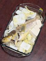 船長ちで大人気のオニカサゴ料理です。 耐熱の器に昆布を入れて、野菜類、お豆腐、そしてオニカサゴ(今回は刺身をとった残りの頭も)を盛り込みます。 お酒を適量振りかけ、塩を軽くぱらり、ラップをかけて電子レンジでチン! 今回は魚が大きいので、600Wで20分ほどかかっちゃいました。 熱々をポン酢に付けて食べれば、いと美味し! 胸鰭のまわりやほほのまわり、頭の中の筋肉・・・、身もふわふわほろほろでメチャ美味いけど、頭まわりはずば抜けて美味い!! 家族で取り合い、譲り合いになりますね~。 作り方は簡単だし、船長ちではオニカサゴ料理、ナンバーワンなんだジョー!