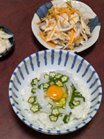 近所のスーパーで国産おくらが特売だったので、残りのマルイカとでイカおくらを作ってどんぶりにしました。 さっと湯がいたオクラを細かく輪切りに、マルイカ刺しと合わせたらどんぶりにオン。 生たまごを落として、醤油は呼子の甘口いか醤油をたらり・・。 絶品いかおくら丼の完成!! 魚屋で売ってる「いかおくら」っていったい何者??、ぐにゃっとしてるし臭みは出てるし・・。 自前の「いかおくら」はまったく別物でめちゃ美味なんだジョー! もう魚屋で売ってるいかおくらには手が出せんな~、これは。