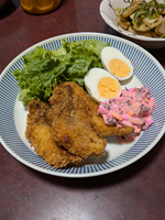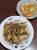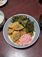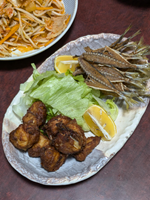 憎きサバフグはぶつ切りにしてから甘醤油に小1時間漬けて、粉ふってから揚げに。 冷凍しておいた小アジの骨はそのまま素揚げに。 合い盛りして完成! つまみのつもりで作ったけど、サバフグのから揚げの味付けが最高で、ご飯のおかずになったんだジョー! いか醤油って意外にもから揚げの下味付けに使えるわ。