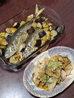 ご近所さんにナスをいただいたので、ナスとジャガイモを使ってチルド室で寝ていた青アジを使ってオーブンでグリルしてみました。 耐熱皿に青アジ、ジャガイモ、ナスを乗せたら、オリーブオイルを回しかけて、レモン汁とハーブソルトを振りかけたら、200度に予熱したオーブンで20分グリル。 青アジなのにやたらと美味い!! 嫁と息子にほとんど食われてしまって、船長はナスとジャガイモの他は頭と骨しか残ってないんだジョー!