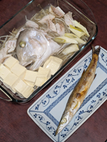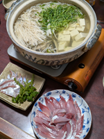 サバ(サバフグ)とサバ(エサ用のペラサバを作った際の余分な身の部分でつみれにしました)を鍋にしました。 ・・・今季2回目のサバフグの鍋です。(笑) 具材はもやし、豆苗に豆腐とえのきに余りニンジン。 締めは玉うどんと超リーズナブルなお鍋です! 普通に美味しいから、家族からはこれで十分だねとのお言葉。 刺身盛りはサバフグにゲソすべて食いちぎられたマルイカ、小カイワリ、小ソコイトヨリのとろろ昆布和えと食材費は掛からずで、3人前作って購入した食材は500円でおつりがきちゃったんだジョー!