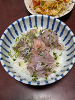 本日はサバフグから解放!! 小ムツのブロッコリースプラウト和え、カイワリのしその実和え、青アジのたたきの3種を角切りきゅうりと白ごまを混ぜ合わせた酢飯の上に乗せた丼を作りました。 生魚に飽き飽きしてる船長ちなので、ただ刺身を乗せただけの海鮮丼では食が進まない。 競り場に出せない余り魚なので、これぐらいの変化球が必要なんだジョー!