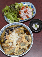 庭の熟れ過ぎのなすを救出! 冷蔵庫で寝てた野菜とバーガー用に切り出したイトヨリの切れ端と極小ソコイトヨリ使って天ぷらを揚げてみました。 衣はサクッと、中はふわっと揚げるこつは冷却した玉子水で粉を混ぜることと、粉は薄力粉と片栗粉をミックスしたものを使うこと。 外サクッ!内はふわっ!イトヨリもソコイトヨリも身が柔らかくて油との相性が良い魚なので、揚げたては誠に美味いジョー! イトヨリは天種としての評価がもっと高くても良いと思うんだけどな~??