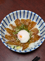 某食鮮館〇〇ーで買い物をした際、ふっと目に入ったお寿司コーナーに置いてあった漬け丼をヒントにチルドで寝かしてたショゴを使って漬け丼を作りました。 ご飯は酢飯(きゅうりの角切りを和えてグレードアップ)、漬けたショゴには白ごまをパラパラ、青ネギ、温泉卵をトッピング。 普通の生魚に飽き飽きしてきたら、漬けにすれば、目先も変わって意外とイケるジョー!