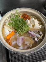 ラインカットにハリスカット、ネクタイはボロボロ、・・知らぬ間にタモですくっちゃうお客もいるから玉網は穴だらけ・・本当にサバフグ厄介ですわ~!ということで、またまた船長んちはフグ鍋です。 まだ10月も終わってないのに今季5回目のフグ鍋です。 今回はイナダやショゴのかまや頭と一緒に余り野菜とともに味噌仕立てにしました。 小鉢に余してたキムチも入れちゃったよ~! 余り物だけど美味いジョー! いつもは水炊きにするけど、たまには味噌鍋も有りかな~? でも味噌鍋はやっぱ豚肉入れたいな~??(笑) 今回の写真は火にかける前のお鍋です・・。