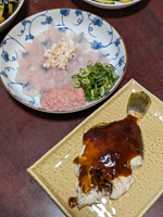時にはこんな高級な魚も食卓に上がっちゃうんですね~。 しかもド定番的な刺身で・・。 新鮮なうちに下処理をして冷蔵庫のチルドルームで保鮮して寝かせること3日。 うま味が回って食感ねっとり、甘みが感じられていい感じに仕上がったんだジョー! もう半身は?アラは?どこいったの??・・実は他のメニューとなりまして、写真とるの忘れて食べちゃいました・・・。