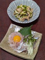 「カイワリ添えイトヨリ剥き身のユッケ風&なごりシイラとセロリの南蛮」