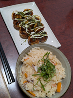潮が全然流れない日、アマダイ釣りしてて仕掛けが流れず底をズッてしまったのかタコが釣れちまった。 たこ焼きにするぞ~!と、持ち帰って茹でたものの、足をブツにしたらたこ焼き器の穴の数に対してタコが余ってしまった。 ということで余ったタコはたこ飯に。 でもタコは茹でちゃったから、生タコから炊き上げたたこ飯のような桜色は出ない・・。 細かく切ったタコに細かく切ったニンジン、出汁用の昆布、色付けのためにめんつゆを少々に塩をパラパラ、ごま油を回し入れたら炊飯開始!! 炊き込みご飯風のたこ飯の完成! あとはたこ焼きを普通~に焼いて・・。 タコ料理としては定番だけど、たまにはこんな変化球も有りかな? たこ焼きとビールは相性抜群なんだジョー!