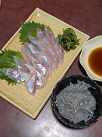 またまたメカリ(カイワリ)の登場、今回は定番のお刺身です。 しらす船に乗ってる息子が現物支給で船主さんからもらってきたしらすも一緒に。 カイワリは程よい脂乗り、まだ活かってるうちに除ったから身も程よく締ってて非常に美味いジョー!! 「庶民のシマアジとは良く言ったもんだよな~?」と言っては、日本酒を口に・・。 しらすは朝採れだからピンと張りがあって甘くて美味い! でも船長は断然釜揚げ派、生は頭の部分のガリっと感、微妙な苦みと臭みが気になってしまって・・。 生しらすは美味いけど、2口、3口もあれば十分なんだけどな~。 船長的にはしらすは釜揚げにめんつゆが一番!!