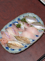 やっと米が手に入ったぜ~!、ということで早速寿司を握りました。 写真上段左から、カンパチ、青アジ(マルアジ)、キバタ(アオハタ)、下段左から、メカリアジ(カイワリ)、イトヨリ昆布締め(ソコイトヨリ)・・・、和名じゃなくて静岡の地方名で呼んであげると、ちょっと地元すし屋のカウンターに座った気分になってきたでしょ??